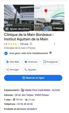 Si vous avez un système de réservation, ajouter un gros bouton bleu « Réserver en ligne » est très efficace pour générer du trafic qualifié. Pour Doctolib, il faut activer un paramètre dans Doctolib Pro, s’assurer de la cohérence entre les motifs de consultation Doctolib et les services Google, puis attendre quelques jours que le « bouton proéminent » apparaisse sur la fiche Google automatiquement.