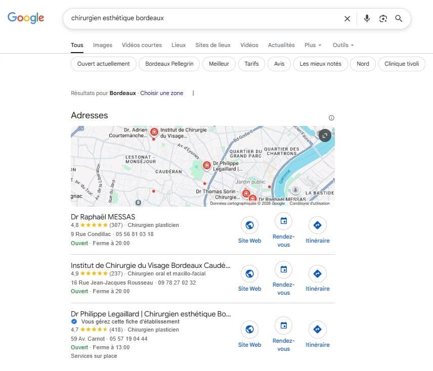 Les fiches GBP apparaissent lorsqu’un utilisateur fait une recherche d’entreprises locales avec un établissement physique (ex. hôtel, restaurant, boutique, agence, etc.) dans Google et Google Maps.
